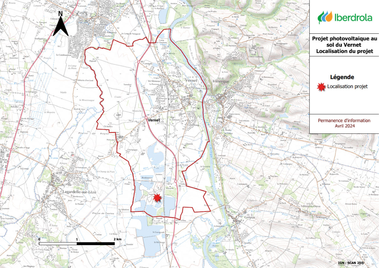 Le projet photovoltaïque du Vernet est situé sur la commune du même nom en Haute-Garonne. Il a pour vocation de produire de l’électricité grâce au rayonnement solaire. Il s’implante sur un site de stockage et de concassage de granulats, au sud du territoire communal exploité par Midi Pyrénées Granulats.